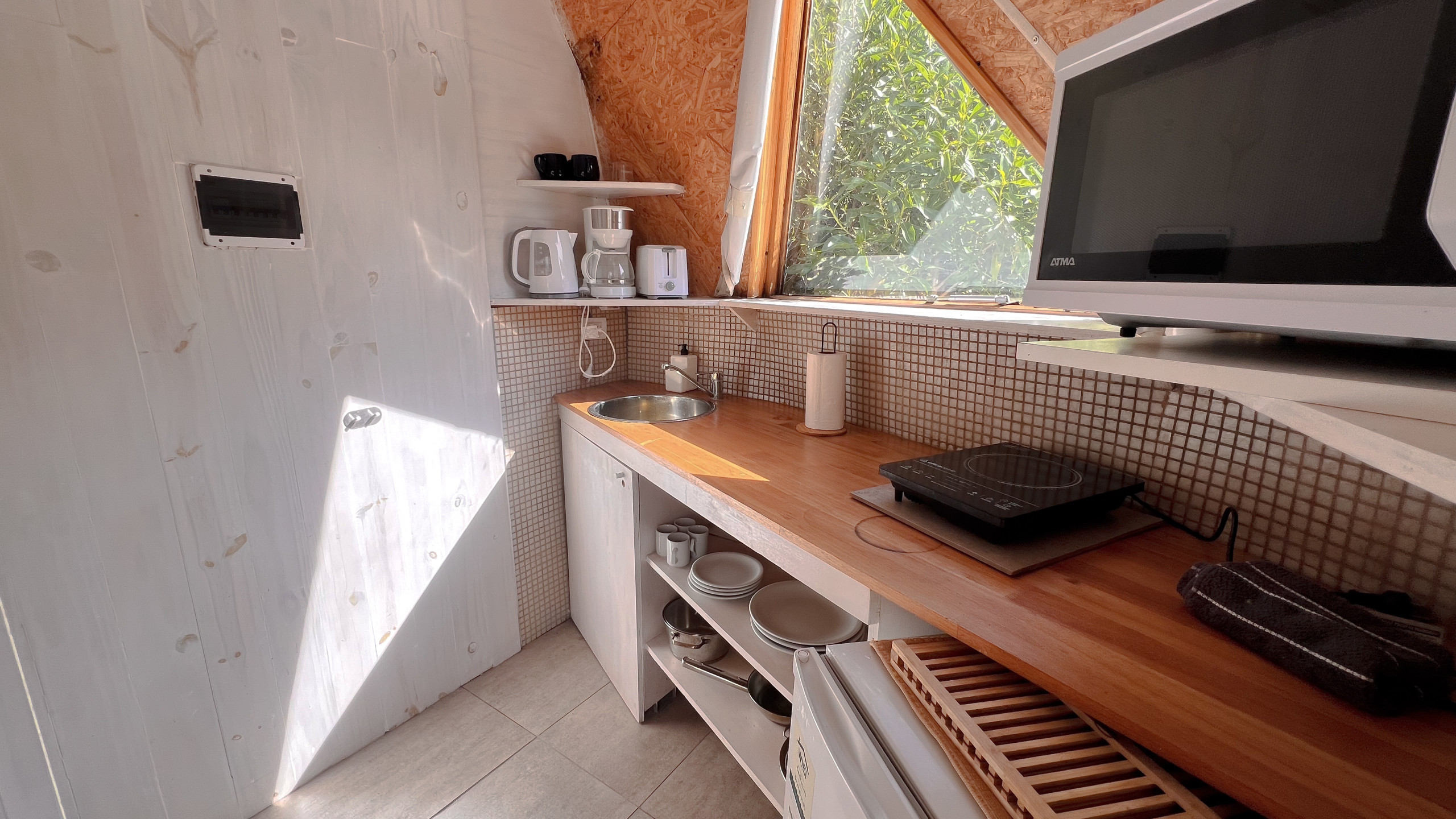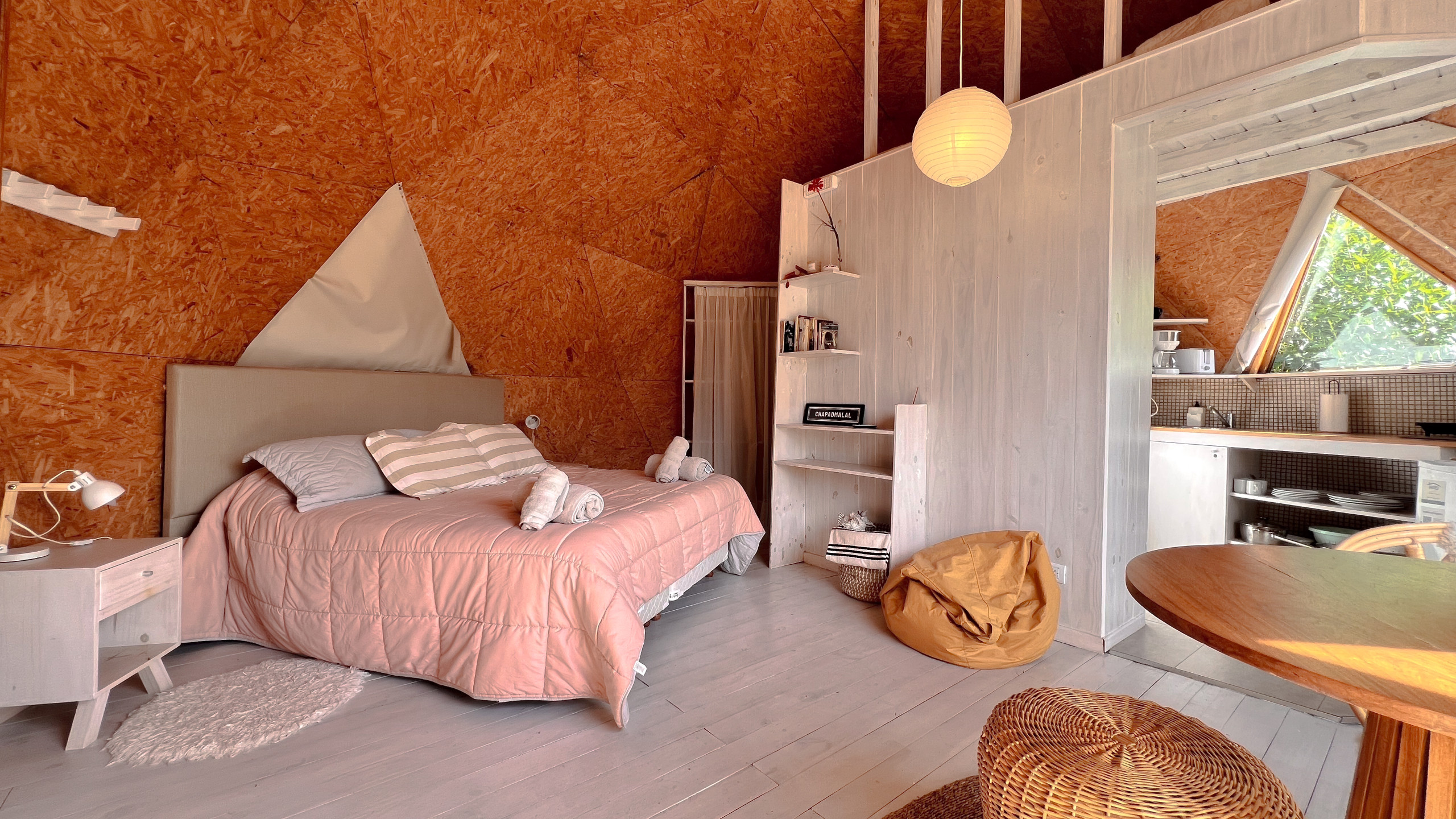 Cada domo es un loft donde entran 2 personas cómodas y una posibilidad de un extra (niño o niña) en un entrepiso dentro de cada unidad. Las camas, dependiendo de la unidad, se pueden adaptar para ser cama doble o camas simples, preguntanos según tu necesidad. Además, una pequeña cocina bien equipada te va a solucionar todas las comidas de tu estadía y el estar-comedor te permite poder desayunar o tomar un vino con una temperatura cálida dentro del domo en el caso de no querer estar en el deck. Cada deck cuenta con reposeras y espacio para poder disfrutar de forma privada tu descanso.