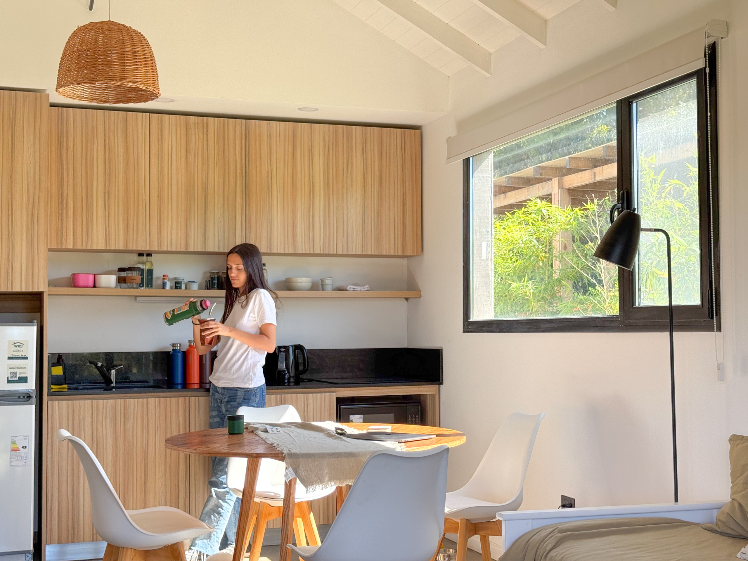 Loft Luna Roja cuenta con un living comedor con cocina integrada, equipado con aire acondicionado y un sofá cama doble que suma dos plazas más para descansar o relajarse. La cocina tiene todo lo necesario para resolver almuerzos, cenas y desayunos sin complicaciones. El dormitorio principal ofrece cama doble, TV Smart, aire acondicionado frio calor y ventanales que conectan con el patio exterior, donde te espera la parrilla y muebles para disfrutar al aire libre.