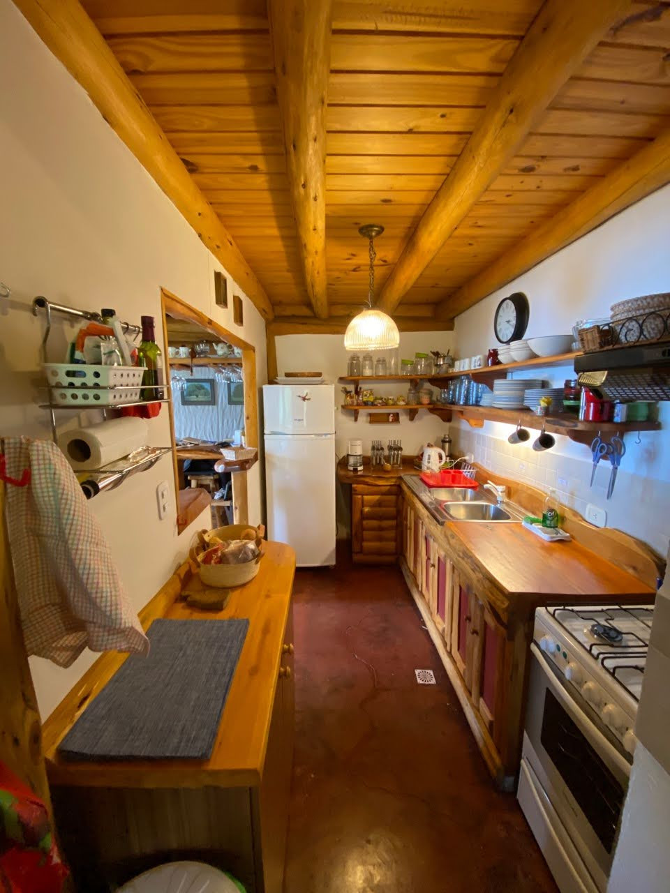 A cozinha independente, de gás, está equipada com geladeira, forno, congelador, louça/talheres e jarro elétrico.