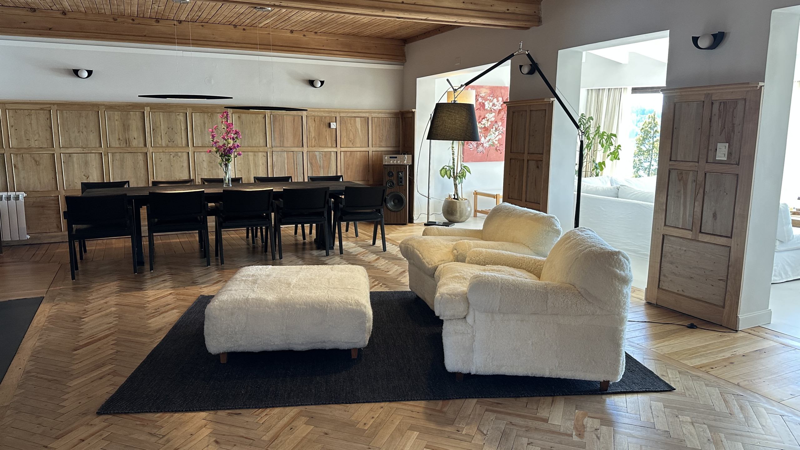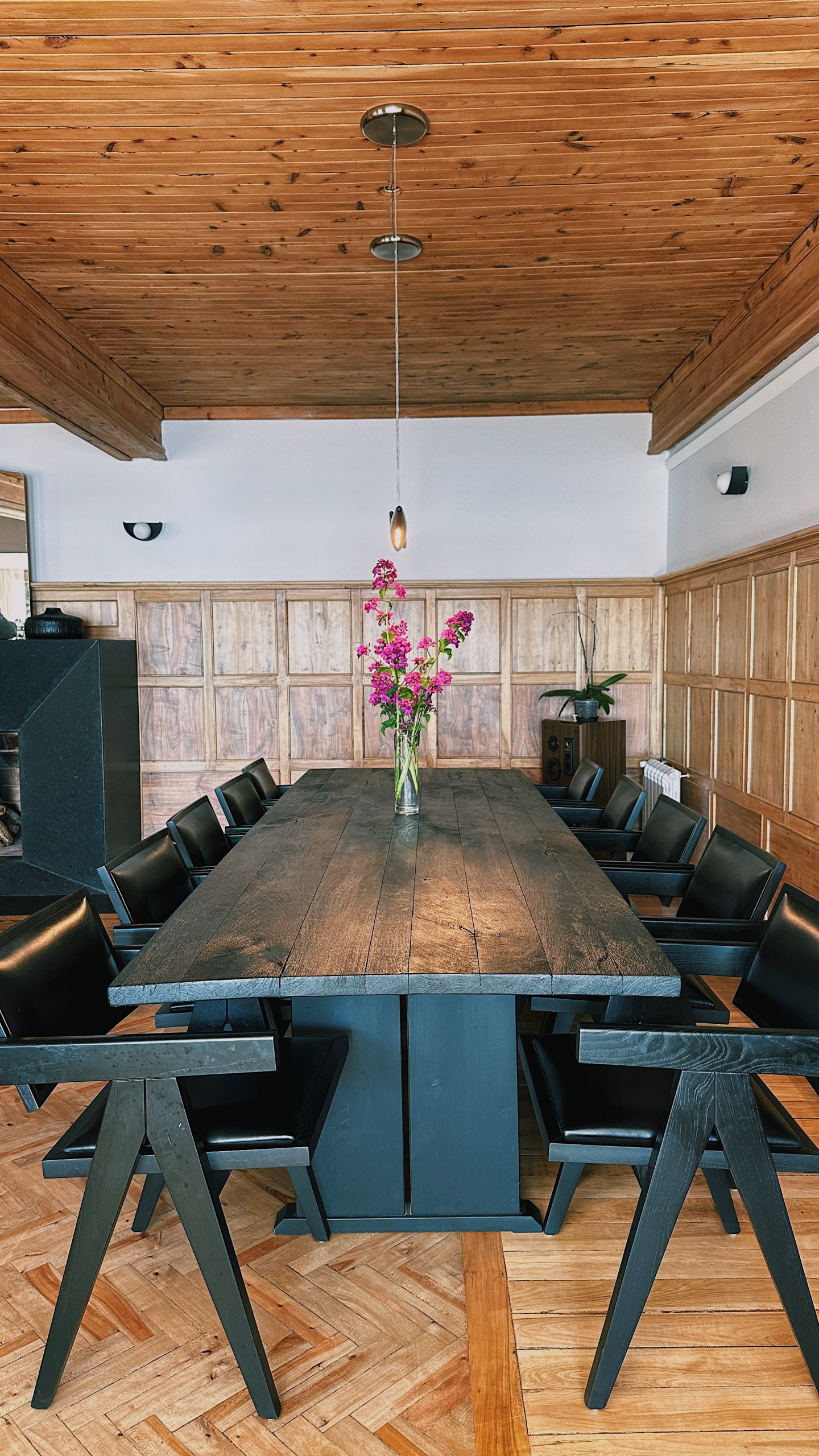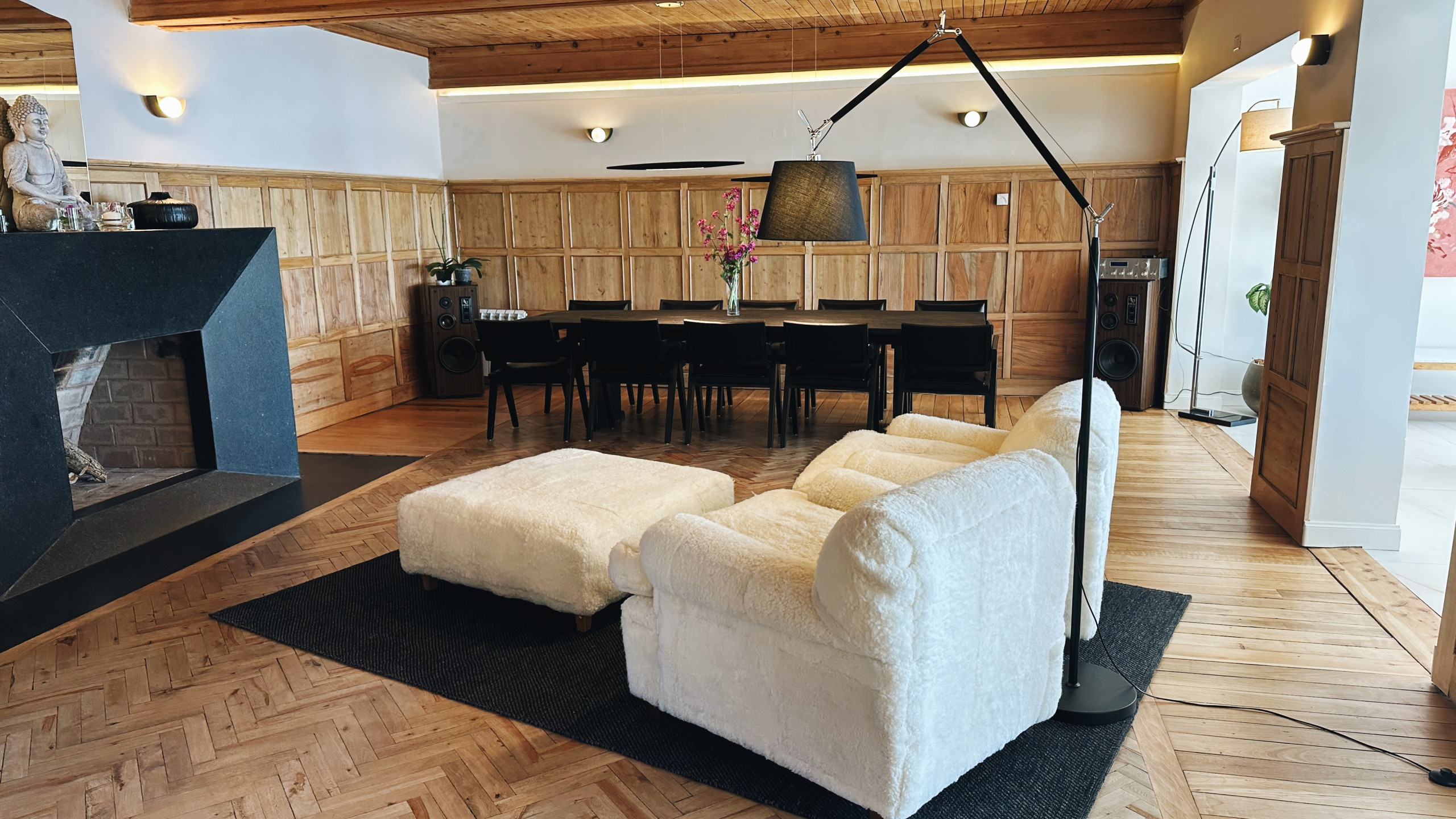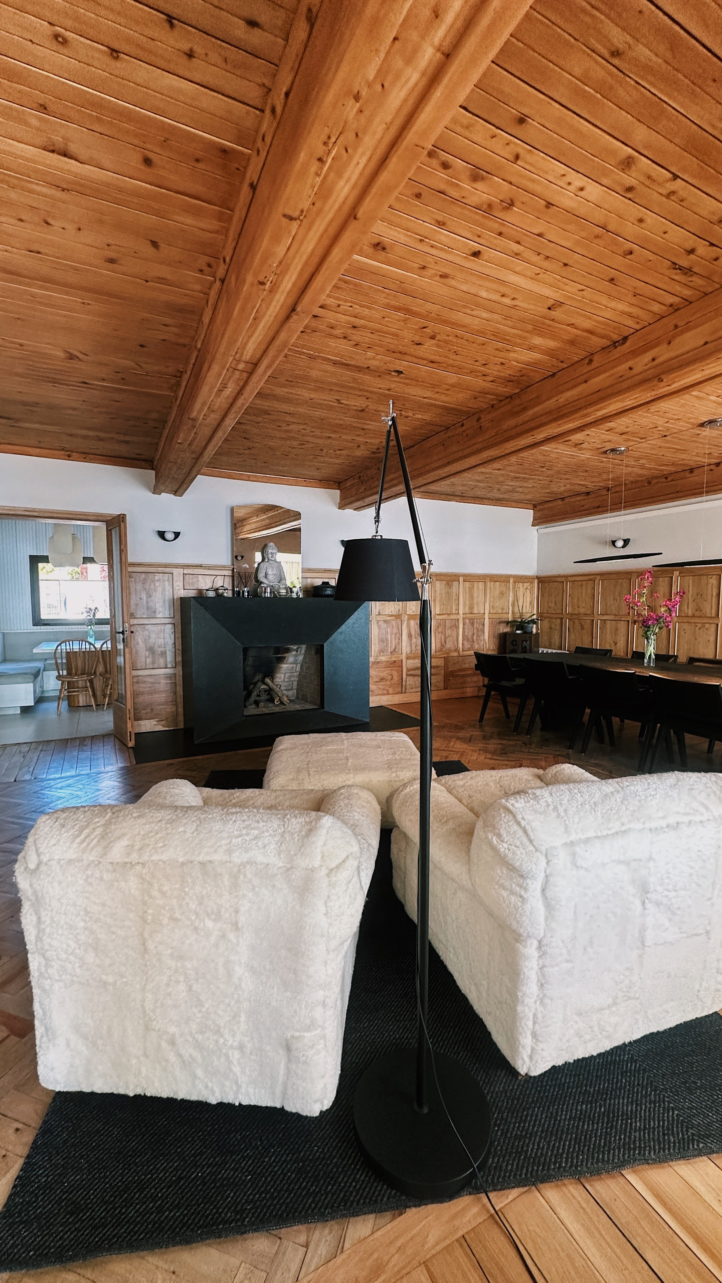 * Grande sala de estar-jantar com lareira, vista direta para o lago e saída para o deck