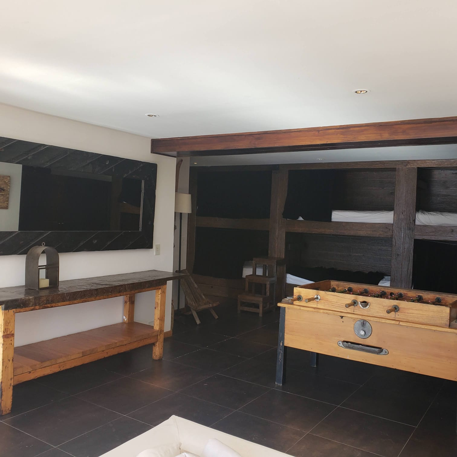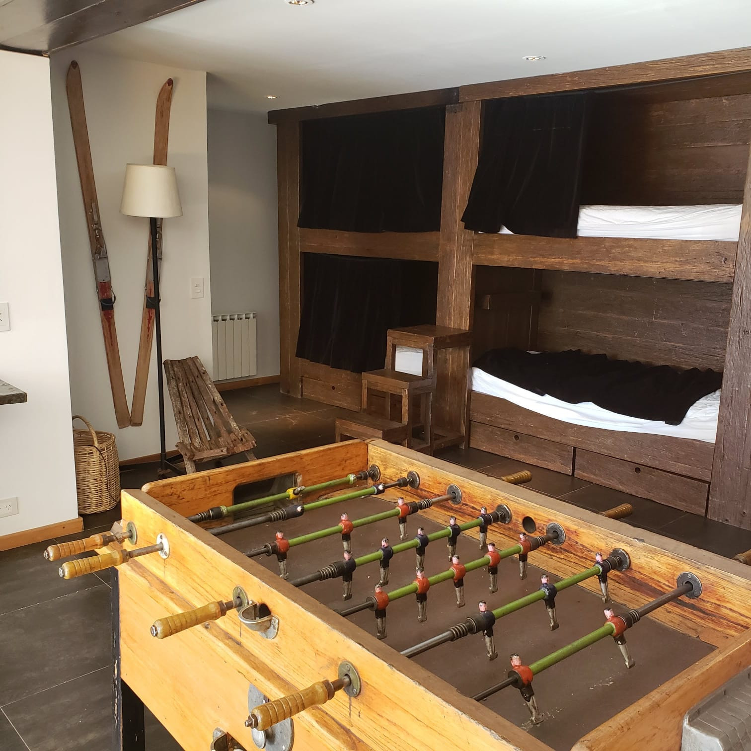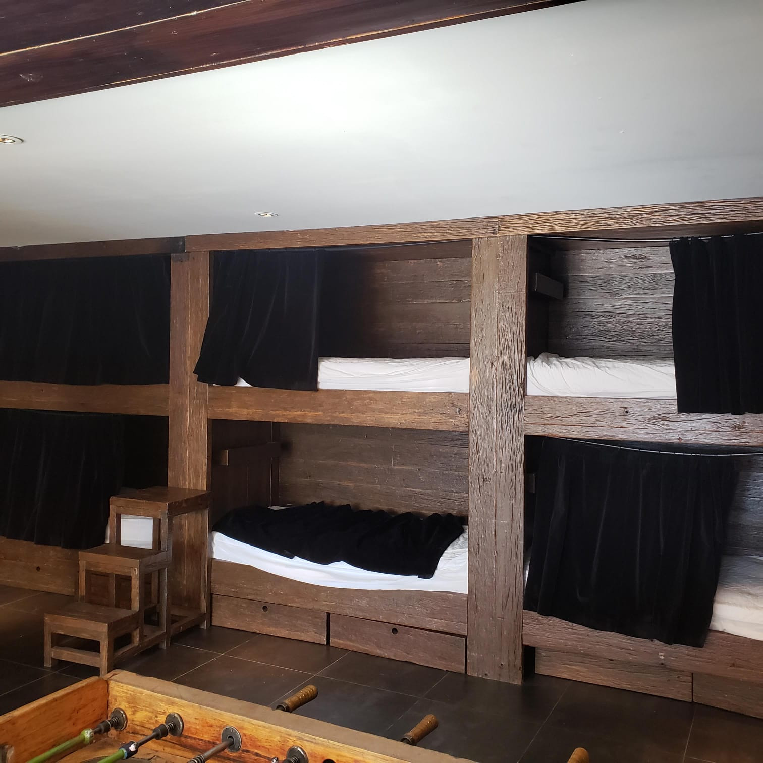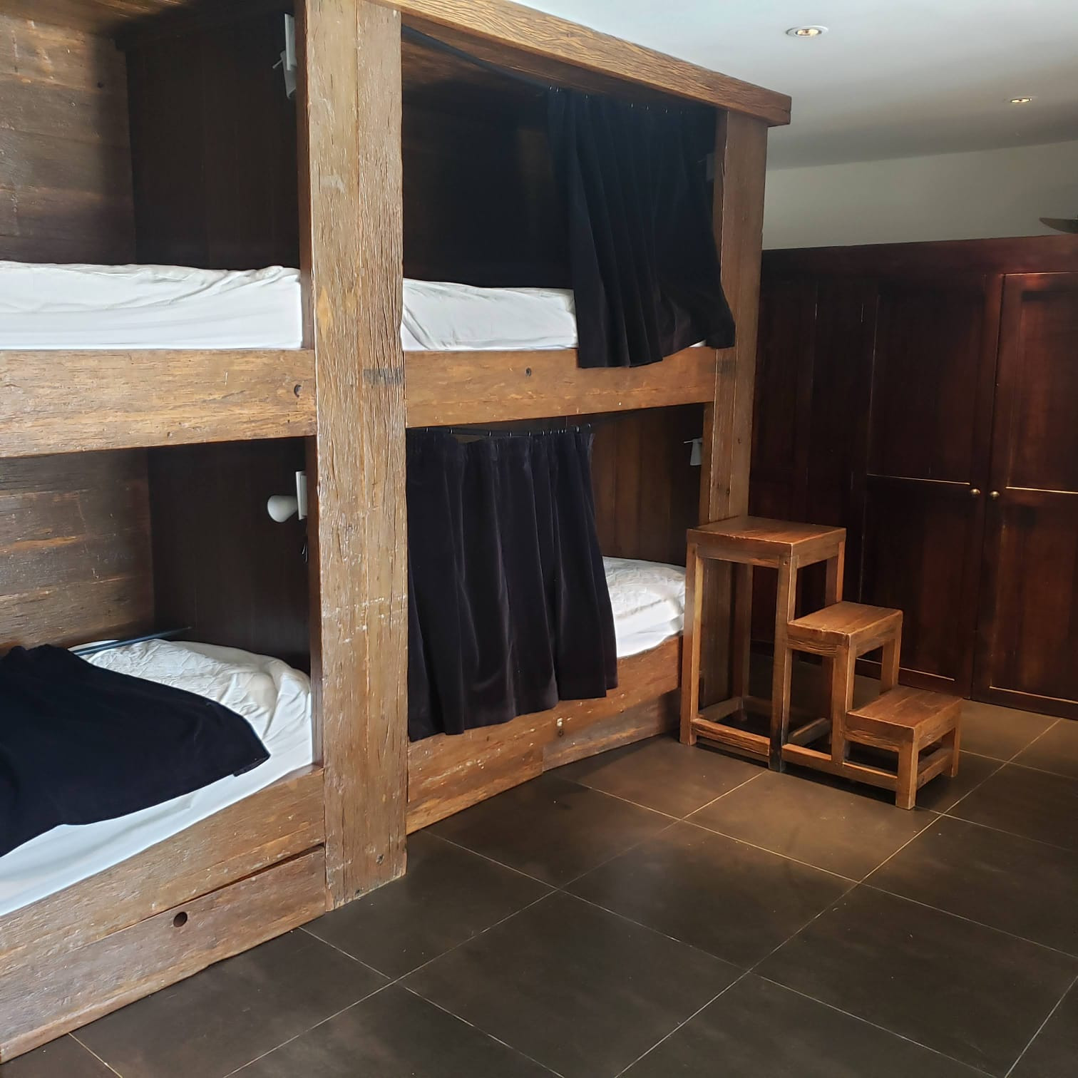 - 1 quarto dividido em dois andares, em um mezanino há uma cama de casal e abaixo há 6 camas de solteiro em beliches, com banheiro.